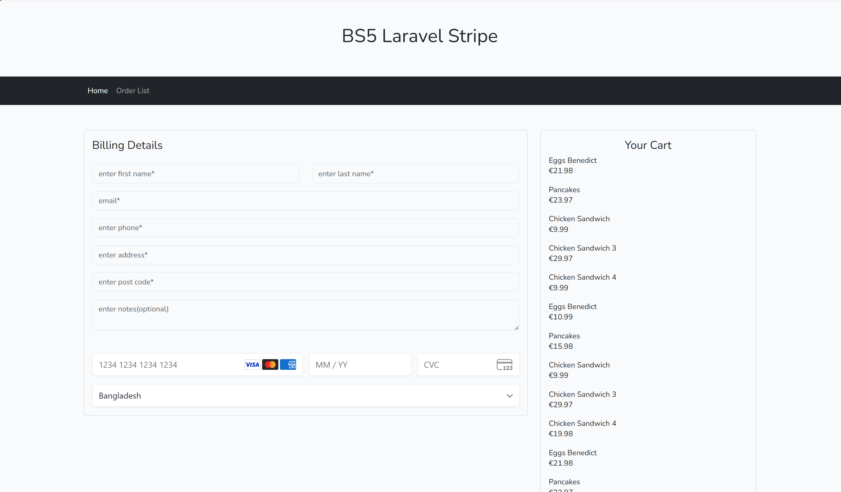 Step 10: Lastly, resources/front/checkout/show.blade.php setup to display customer billing detail and payment form with their carted list of items. Also v3 JS library of Stripe and custom JS checkout.js are added for client side stripe api handling at the bottom inside of checkout/show.blade.php.